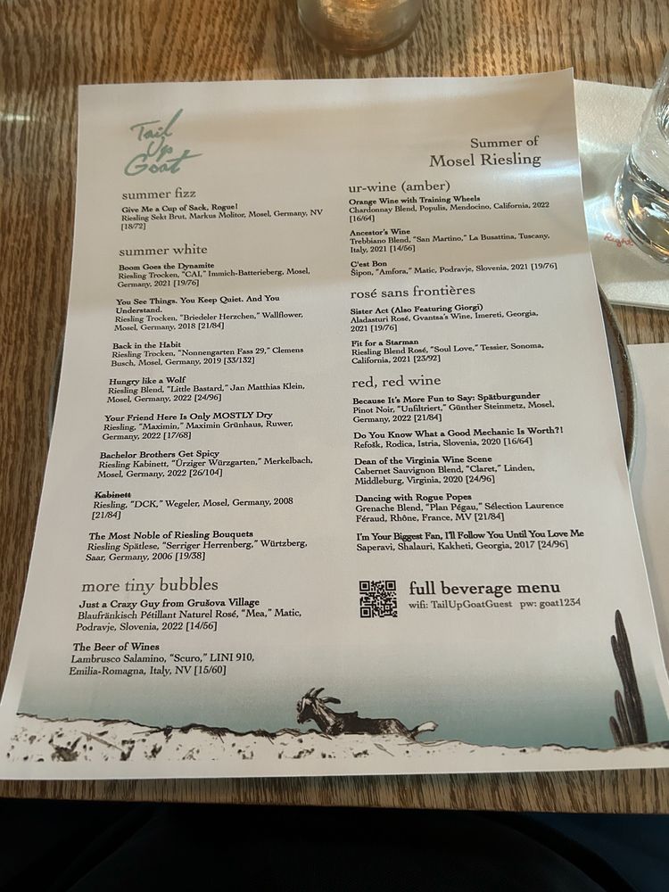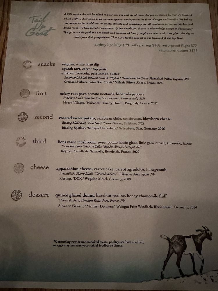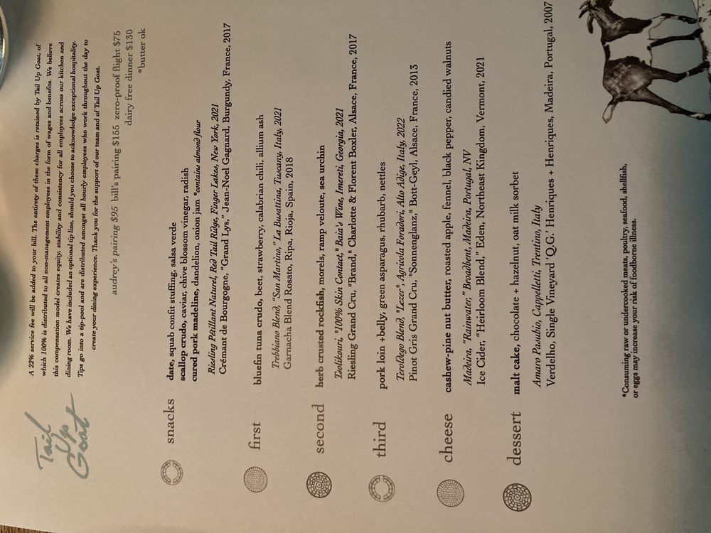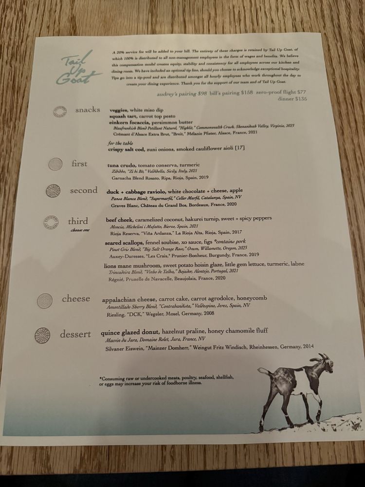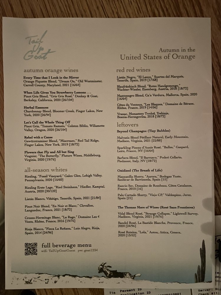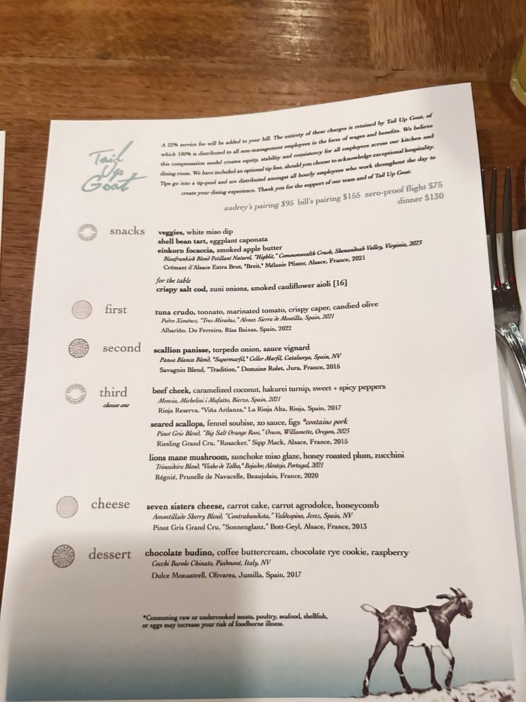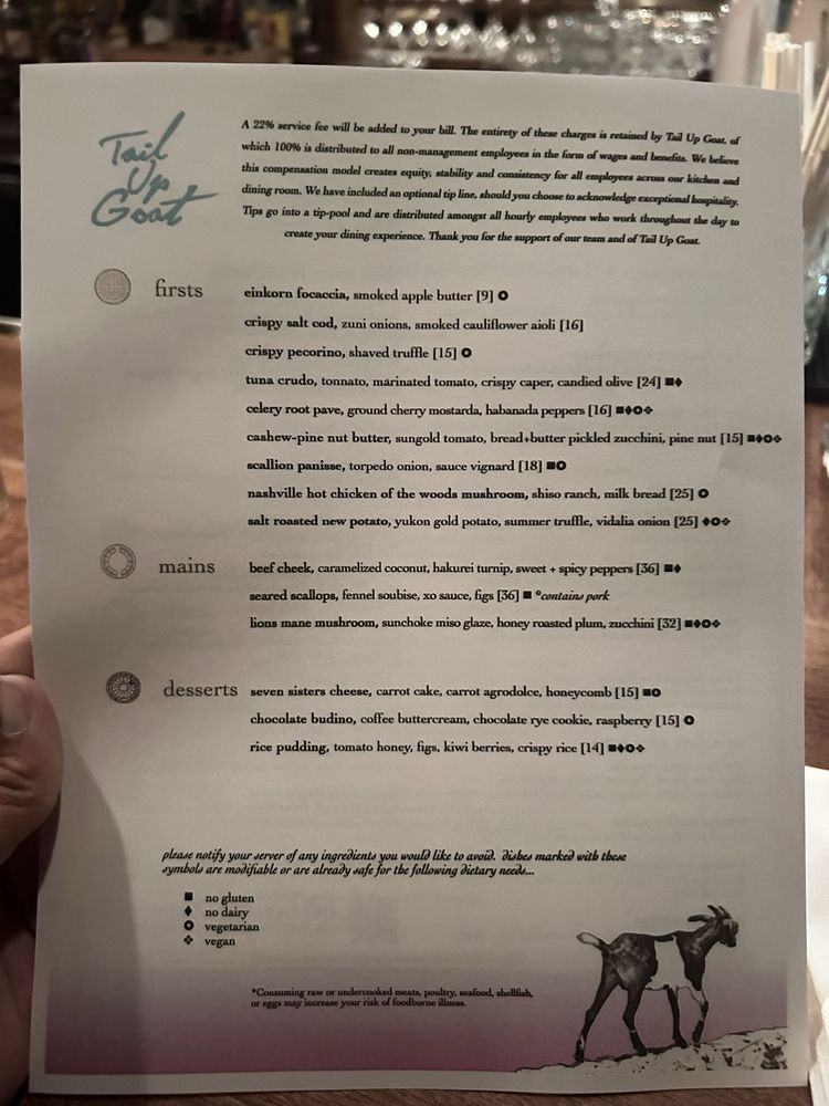 Introducing the menu at Tail Up Goat, an Italian-New American bistro in Washington, DC, promises an impressive culinary journey. With its relaxed, trendy atmosphere, the restaurant caters to a diverse clientele, offering everything from pescatarian to vegan options. Your experience might begin with delightful snacks like salted cod bites or grilled focaccia with apple butter. The mains shine with elevated offerings such as the comforting beef bourguignon and innovative lion’s mane mushroom paired with curried squash. Don't miss their decadent desserts, particularly the layered chocolate cake paired with pear butter. Guests rave about the attentive service and the inviting ambiance, making Tail Up Goat a perfect gathering spot for friends and family. Whether you’re enjoying a casual dinner or celebrating a special occasion, this spot hits the right notes of comfort and creativity.